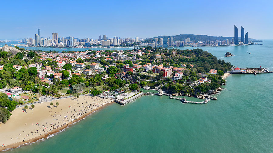 游人在厦门鼓浪屿沙滩上游玩(无人机照片)。新华社记者 姜克红 摄