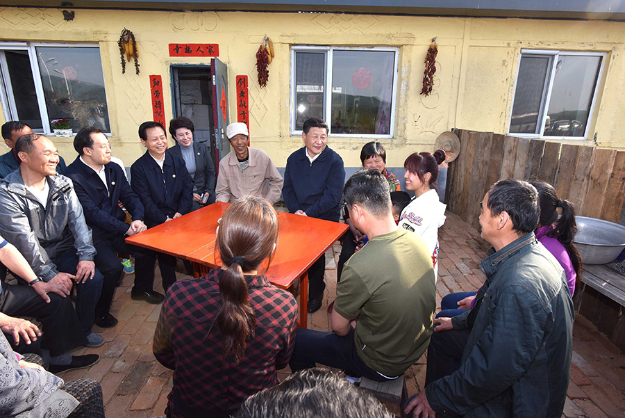 2016年4月24日下午,习近平在六安市金寨县花石乡大湾村向村民们了解脱贫工作情况。新华社记者 李学仁 摄