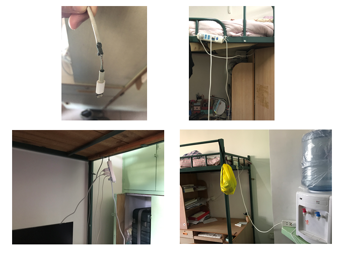 2、宿舍内存在电源线、网线等私拉乱接、缠绕过乱的现象,影响宿舍整体的安全及整洁度;