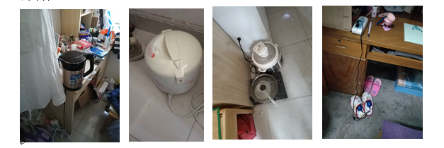 1、部分员工使用违禁电器,例如电饭锅、烘鞋器、热水壶、电热毯等,将插线板随意摆放在被褥上,人走未断电,用电安全意识较薄弱;