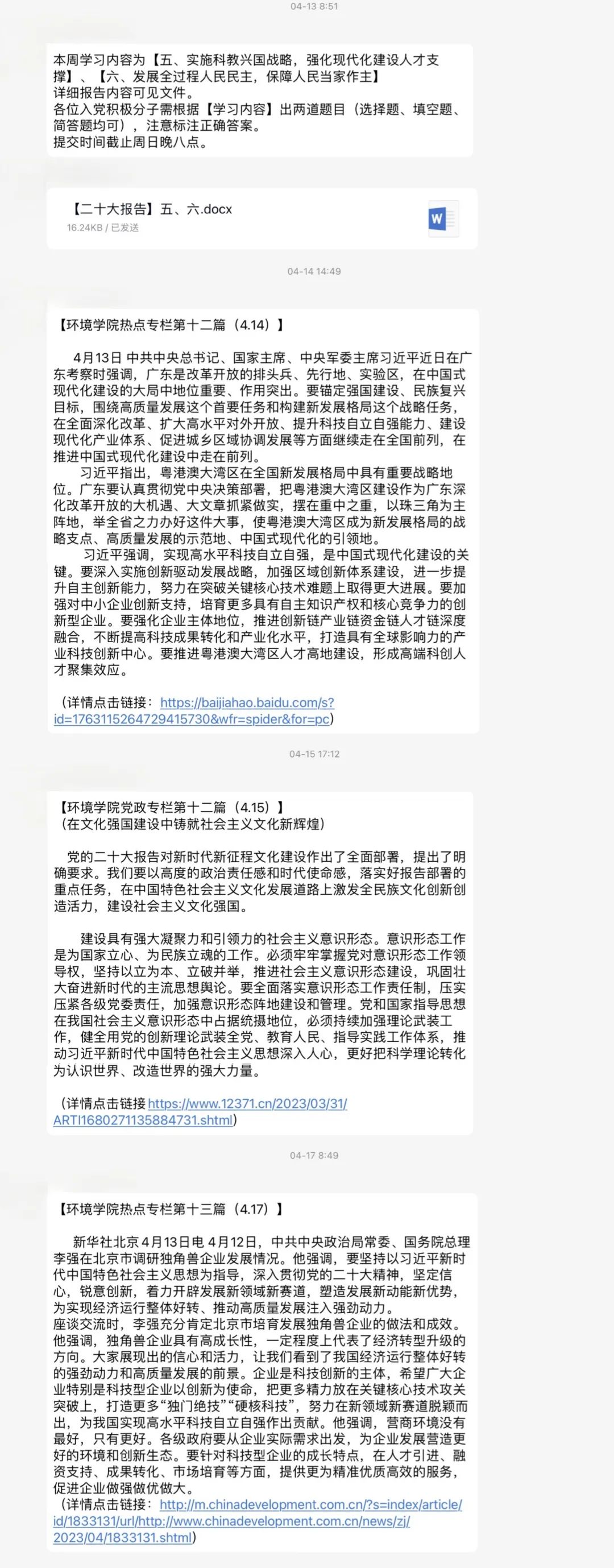 为贯彻落实党的二十大精神,响应华中大“党旗领航工程”的号召,进一步加强2021级同学们的政治素养,做好入党积极分子的培养教育工作,鼓励大家进一步学习党的基础理论知识,beats365组织21级入党积极分子围绕党的二十大报告进行学习,并以班级为单位建设学习专栏,每周定期发布推送,聚焦时政热点,以便于同学们日常学习积累。