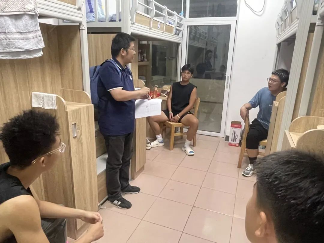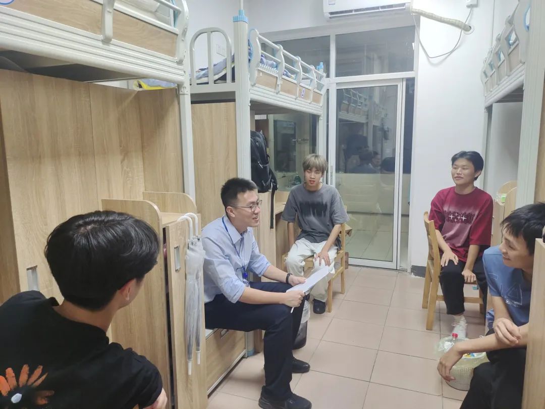 杨凯老师向新生介绍了电费、校园网等在校生活方面常见问题与解决办法,与同学们愉快地交流,氛围轻松,并询问大家对宿舍环境的感受,表示将尽可能为同学们创造良好的学习生活条件。他希望同学们敢于表达自己,与同学、室友多交流,展现阳光积极的老员工风貌。