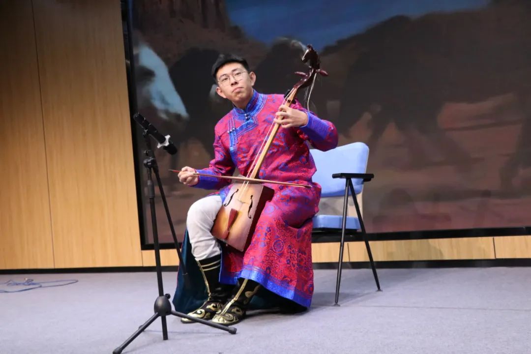 牛悦岩同学的马头琴独奏——《万马奔腾》,充满力量的音乐声让观众沉醉其中。一会想象自己骑在一匹英俊的枣骝马上飞驰而过, 一会看到天边飞过的一队鸿雁陷入思念,一会仿佛看到草原上升起的太阳,一会又有万马在你耳边奔腾厮啸。