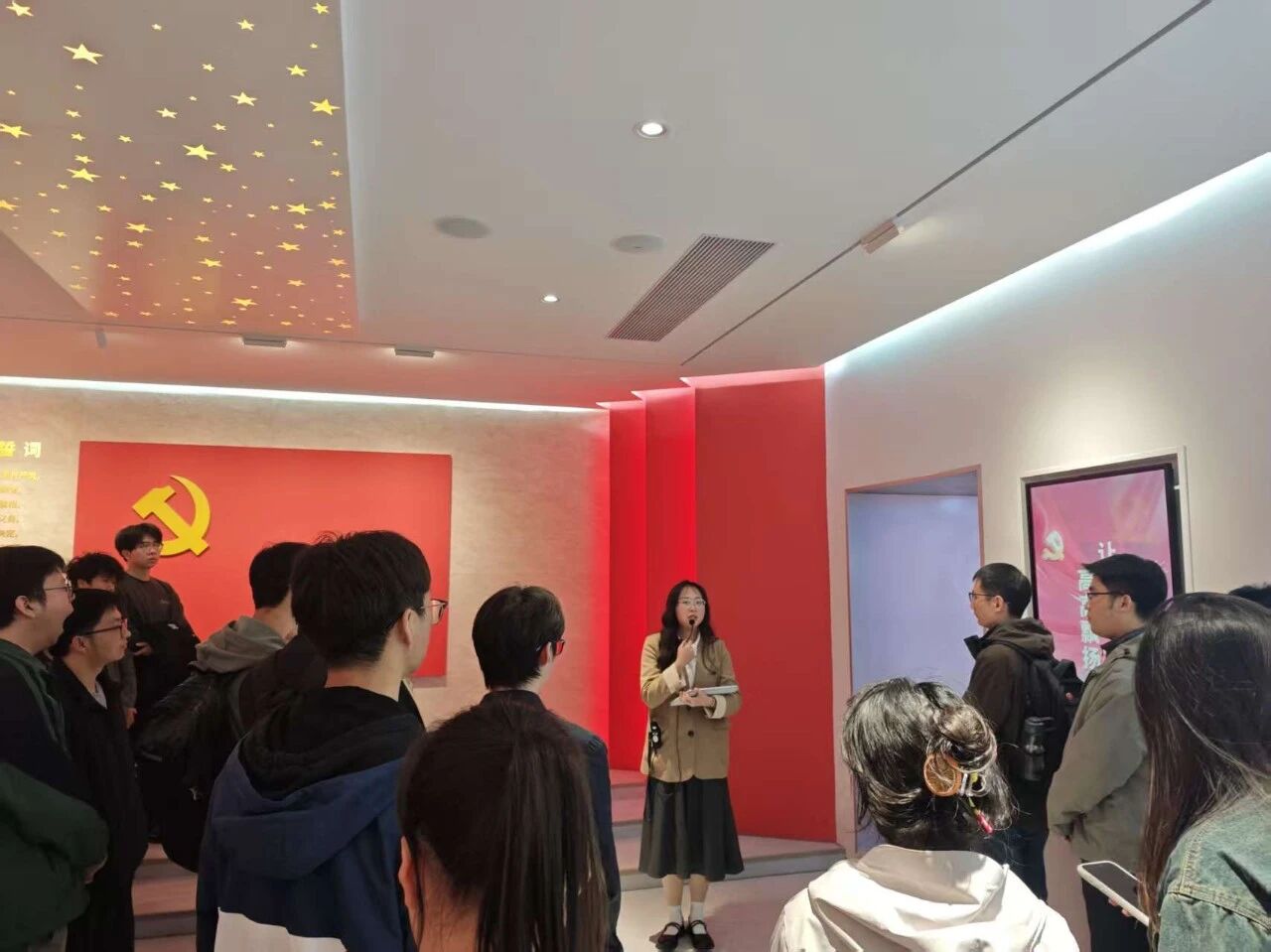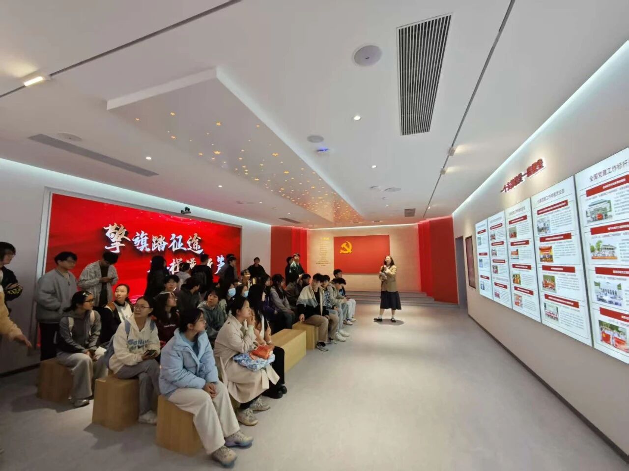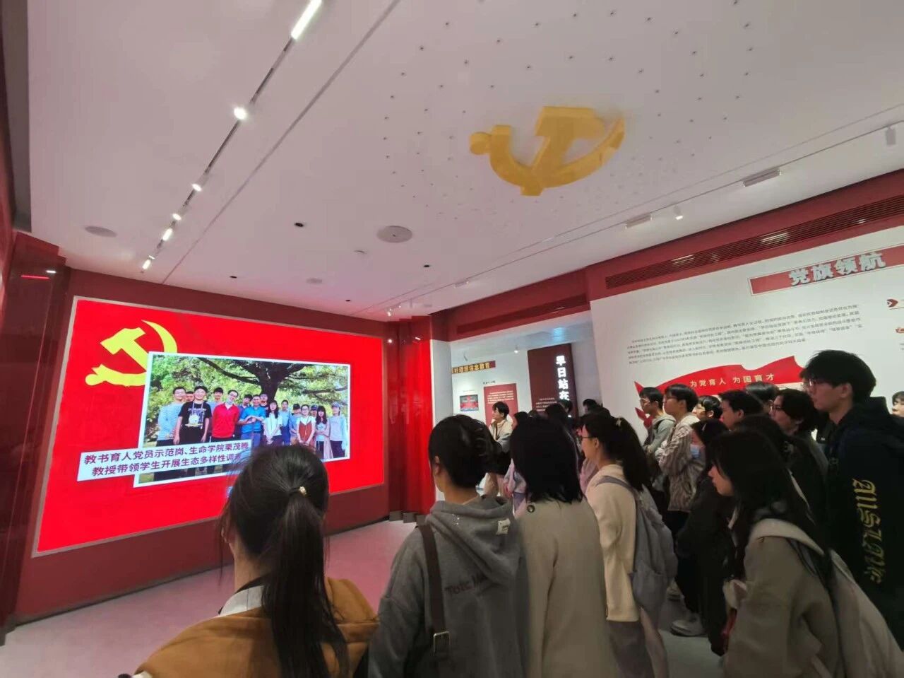 为强化理想信念教育,传承红色基因,提升综合素养,beats365于11月13日下午4点组织2025级新生党员、研究生入党积极分子和党建工作中心成员参观位于南四楼一楼的“党旗领航”教育基地。