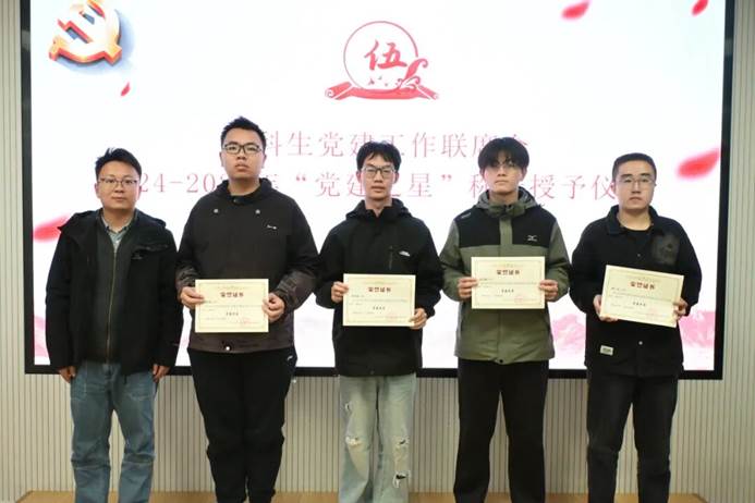 大会第五项议程:24-25年“党建之星”荣誉称号授予仪式。在全场热烈的注视下,辅导员杨凯老师面带赞许的微笑,走到每一位“党建之星”面前,庄重地将沉甸甸的荣誉证书递到他们手中,并致以真诚的祝贺与殷切的勉励。