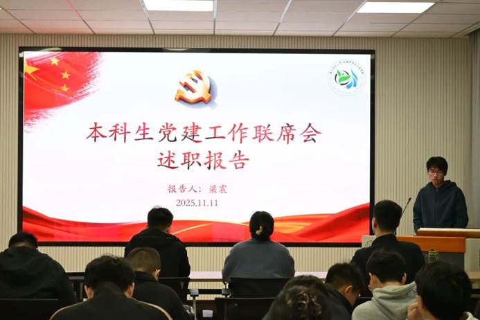 随后本科生党建工作联席会负责人梁震进行了本科生党建工作联席会年度总结。他的汇报从团队建设、党性修养、党旗领航、宣传教育、未来展望切入,阐述了本科生党建联席会过去一年在哪些方面做出了努力、当下正在克服的困难以及未来美好的展望。