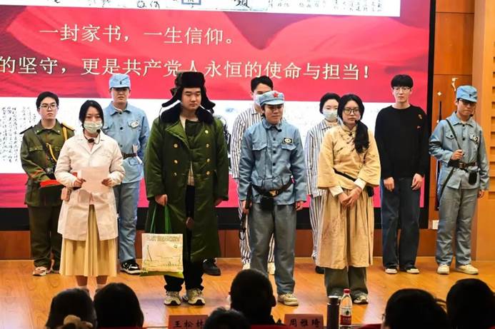 研究生第四党支部的节目《百年家书,一脉相承》通过演绎赵一曼的绝笔、左权的烽火家书、孔繁森的雪域深情与李兰娟的抗疫誓言,将百年间共产党人跨越时空的信仰与初心凝成一脉相承的炽热家国情怀,震撼人心。