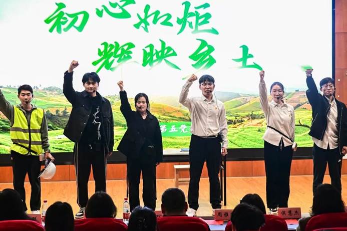 研究生第五党支部压轴出场,给我们带来了《初心如炬,辉映乡土》情景。剧目生动演绎了一位选调生深入田间地头,运用他的专业知识,破解乡村发展难题的奋斗故事。他用青春的智慧与汗水,将论文写在祖国大地上,以实际行动诠释了新时代青年党员扎根基层、服务人民的炽热初心与使命担当。