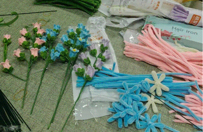 活动现场,五颜六色的扭扭棒摆满了桌面,同学们无需自带工具,只需带上创意与热情——扭一扭、弯一弯、缠一缠,原本普通的小棒子在指尖渐渐舒展,化作一片片灵动的花瓣。大家相互交流灵感,你教我卷边,我帮你定型,欢声笑语间,一束束精致的手工花陆续绽放。每一朵花,都承载着对女性师长的敬意与祝福,也凝聚着同学们最真挚的心意。