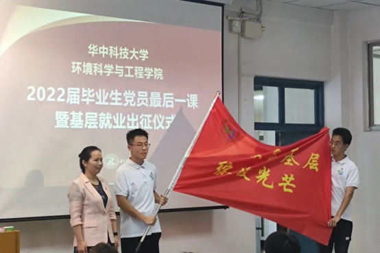 活动的最后,刘利剑老师为党员毕业生授出征大旗,基层就业毕业党员代表高伟同学上台接旗,并合影留恋。接着全体人员起立进行就业宣誓,坚定初心,牢记使命。