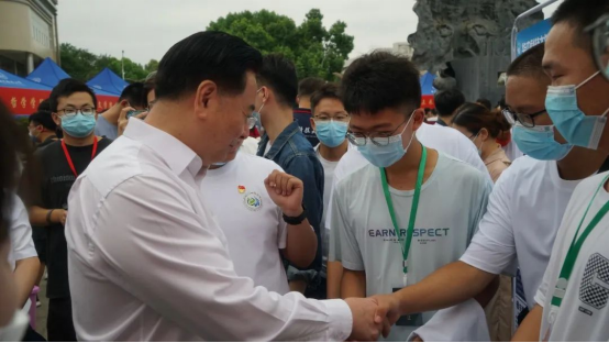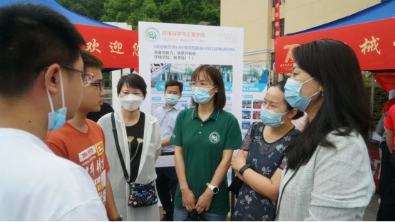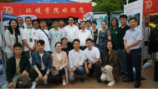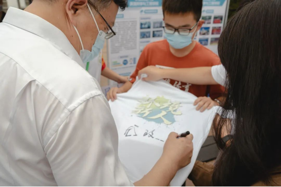 李元元书记寄语新生“要有久久为功的心态,在环境领域做到极致。”;尤政董事长聆听志愿者讲解公司迎新特色做法,并为新生文化衫签名留念。