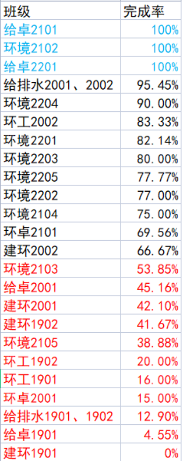 上表为上周青年大学习各团支部完成情况排行榜。这是本学期第二次有关二十大的特辑,大部分同学学习热情高,不少班级完成率达到了100%,但是还是有少数班级积极性不够,希望下周进步。不过相较前几周,完成率为0的班级减少,说明大家对青年大学习的重视程度正在提高,希望再接再厉。“青年大学习”网上团课学习为每月主题团日规定动作,请各级团支部督促支部团员每周按时参与完成学习内容,院团委将对各团支部完成情况进行统计,并作为每年团支部团学工作重要考核依据。希望更多支部向完成率百分百的团支部看齐,加强理论学习,提高网上团课学习的参与度。
