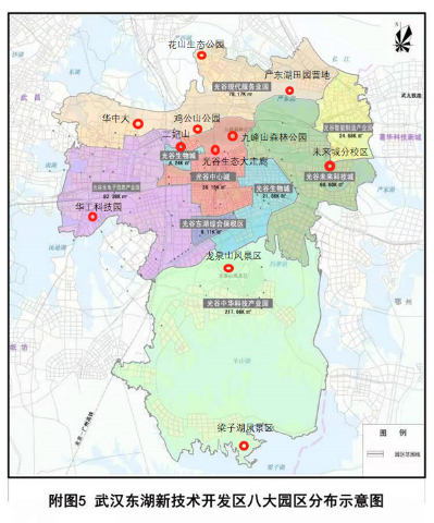 近年来,武汉市坚持以人民为中心的发展思想,秉承创新、协调、绿色、开放、共享的新发展理念,大力推进生态文明建设,致力于在武汉东湖高新区打造高效生态经济示范区。东湖示范区内部根据主导产业功能分为八大园区,区内共计56处生态旅游点均衡分布在八个产城融合的园区内。十余处大型公共生态文明设施均衡分布于产业园内,北接严西湖有花山生态湿地、花山生态艺术馆以及常见山国际运动公园;西接汤逊湖有华工科技园、汤逊湖风景区;南接梁子湖有梁子湖风景区、梁子岛;东部光谷未来城区,各高校分校区林立,教育、生态、经济发展齐头并进;光谷中心城区由光谷生态大走廊将大量的公园(严东湖湿地公园、花山河公园、九峰国家森林公园、豹子溪公园、新月溪公园、龙泉山风景区)和绿地有序联系在一起,形成“湖景+山景+阳台(天台)+光谷中心城公园体系”的公园城市景观体系,形成充满艺术感染力、运动生命力和文化承载力的休闲共享空间,形成具有光谷特色的世界级生态大走廊,助力武汉东湖高新区创建国家生态文明建设示范区。