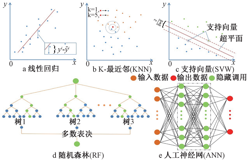 为训练机器学习模型,一般将数据分为训练集、测试集和验证集三个部分。首先,基于已选机器学习算法利用训练集对模型进行训练;其次,利用验证集数据通过调整超参数的方式优化训练后的模型;最后,将测试集输入训练好的模型中,比较预测输出与其相应的已知结果,以评估训练模型的预测能力和泛化能力。相关系数(Pearson correlation coefficient,R2)、平均绝对百分比误差(Mean absolute percentage error, MAPE)、平均绝对误差(Mean absolute error, MAE)、均方根误差(Root mean square error, RMSE)、相对标准偏差(Relative standard deviation, RSD)、性能效率、精度等参数可用于评价模型准确性。常见的机器学习方法包括随机森林、支持向量机、人工神经网络、深度学习、模糊控制等。每种算法都依据其机理的不同,各有长处,应用场合也千差万别。不同算法之间也可以相互结合,取长补短,提高精度。单独算法往往存在一定缺陷,因此在复杂的水务工作中,通常将多种算法相互结合,共同控制。