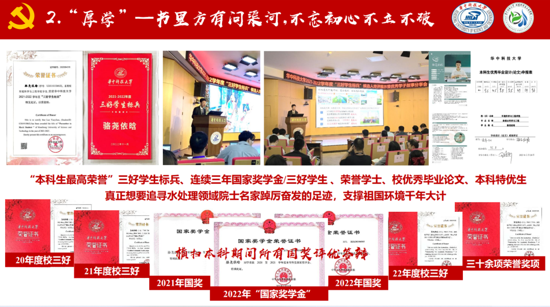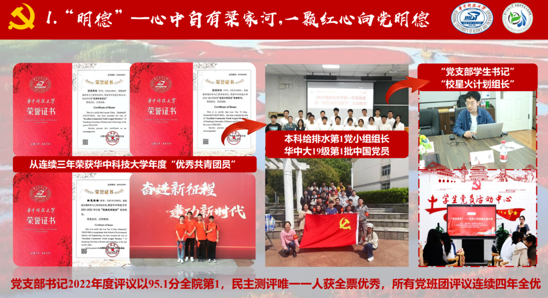 党员先锋更在于求是,“纸上得来终觉浅,绝知此事要躬行”。本科期间,骆尧依晗带领6个党员先锋队考察水环境、乡村振兴,走遍大江大河,所有实践全获评优秀,开展关于中国西北偏远地区农村净水设施使用现状线上调研获校社会实践优秀团队,根治水健康问题,将绿水青山的誓言以实践书写在祖国大地上。而党员模范似一滴水,汇集万千方成河,骆尧依晗以全国环境类高校拔尖创新人才云端交流分享辐射全国、以全国青少年高校科学营在华中大喻见,传播环境之声,宣讲华中大精神,在党旗之下崇敬上善若水、歌颂碧水蓝天。