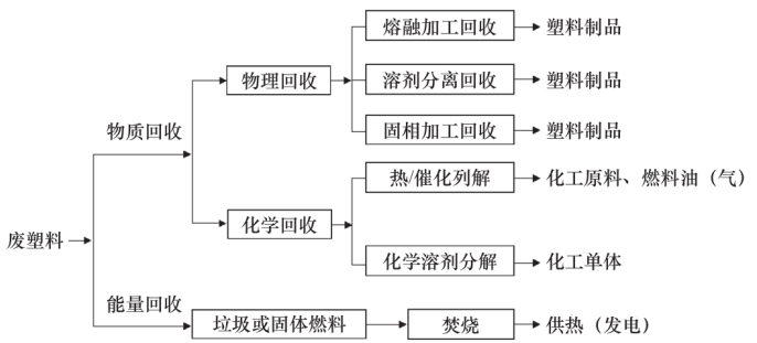 化学回收采用裂解技术将废弃塑料降级回收为可再次使用的燃料或化工原料(乙烯、丙烯等)。由于装备复杂、能耗高,易产生有害废气造成二次污染,经济性较差。催化裂解和溶剂分解是化学回收的发展方向,但尚需提高催化剂效率和发展绿色溶剂。