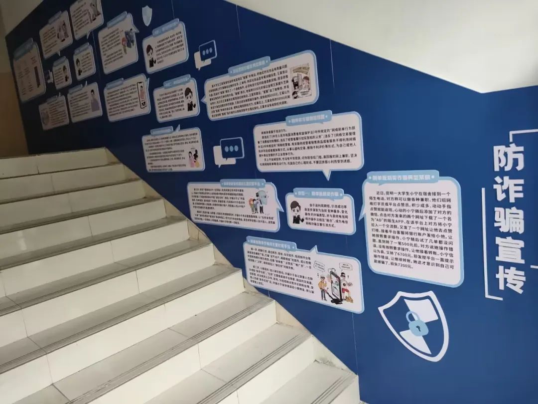 愿人间烟火处,处处平安。宿舍楼的第四层主要介绍了平安社区,里面有公司安全工作小组的描述以及各楼栋、楼层安全员的公示,同学们在宿舍内遇到安全问题也可寻求他们的帮助。公司还专门设置了防诈骗宣传栏,内有各种类型的诈骗案例,堪称宿舍楼内循环播放的《孤注一掷》,请同学们引以为戒。