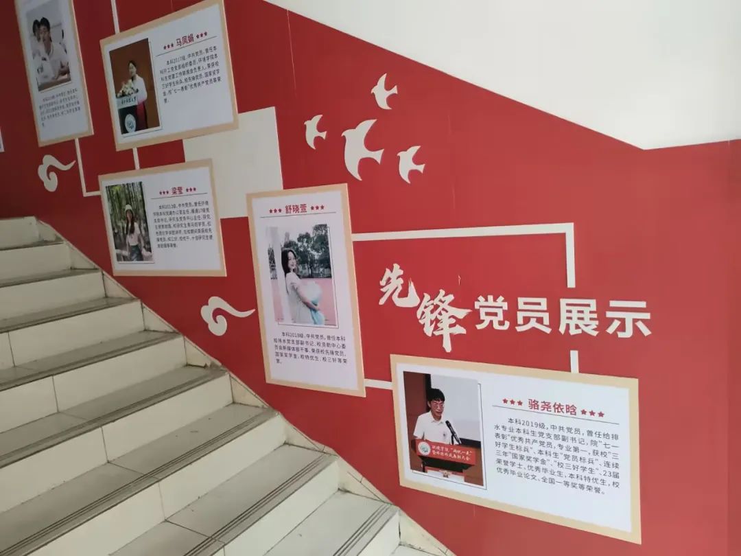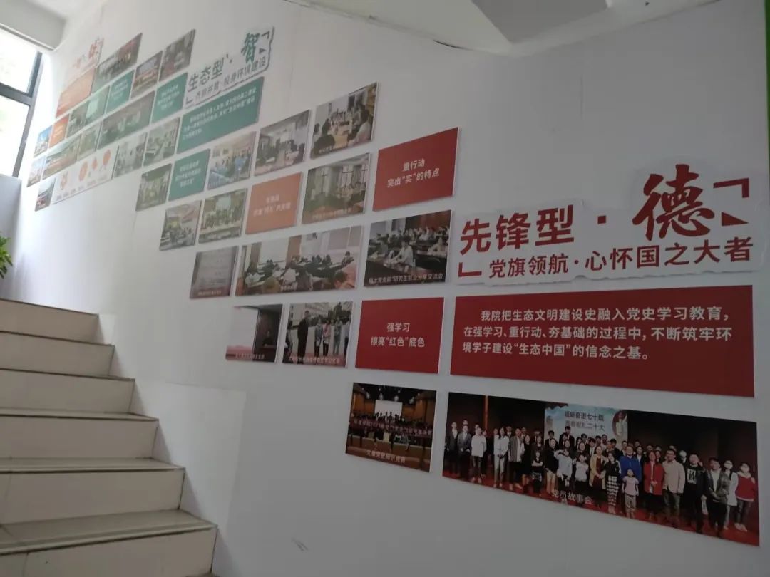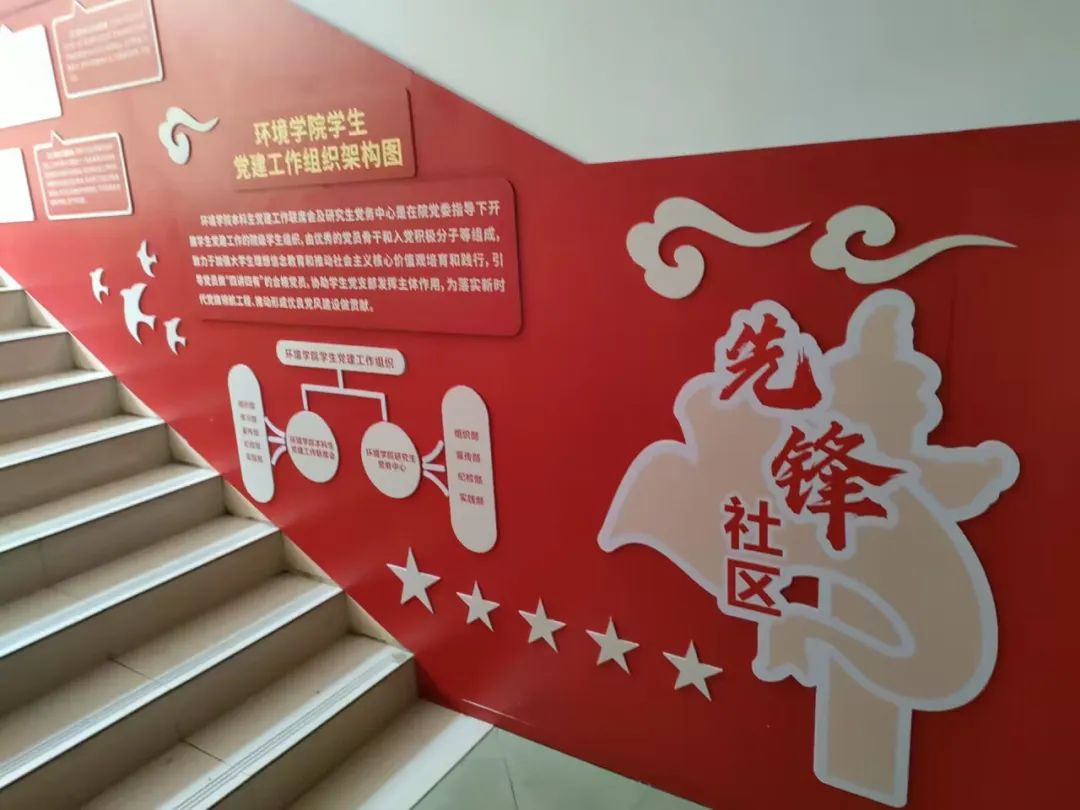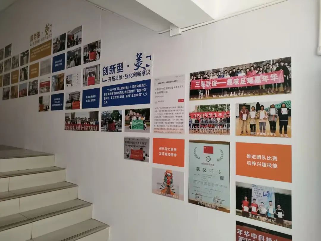 在宿舍楼的一层是公司“环境新人”育人展示长廊,从“党建引领、专业发展、文体活动、创新实践、公益服务”五个方面集中展示了公司育人思路与育人成果,号召同学们努力成为具有家国情怀的新时代卓越环境人才。