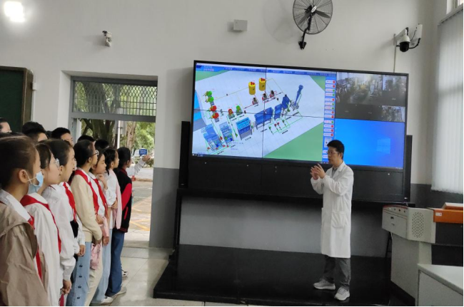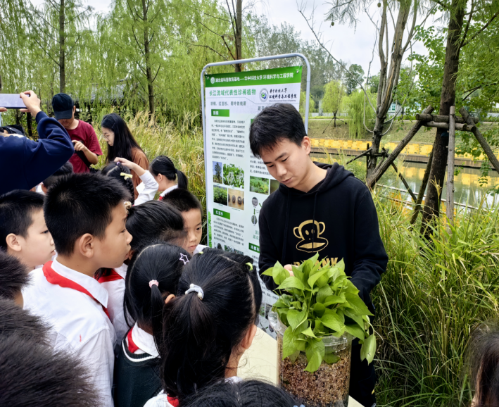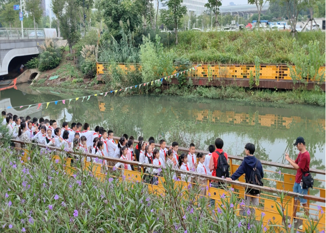 在湖溪河科普站,讲解员带领小同学们沿河查看湖溪河近年来的治理情况,在途中讲解到湖溪河的前世今生:从湖溪河名称的由来,到八十年代被工业污染,再到响应生态文明建设,随着政府与公司的投入和治理,湖溪河重新实现水清岸绿的华丽转身。科学技术是第一生产力。从一条曾经宽1.5米的臭水沟到现在景色优美、环境宜人的湖溪河,其中所涉及到的环境保护技术也由讲解员通过通俗易懂的语言介绍给来访的小朋友们。