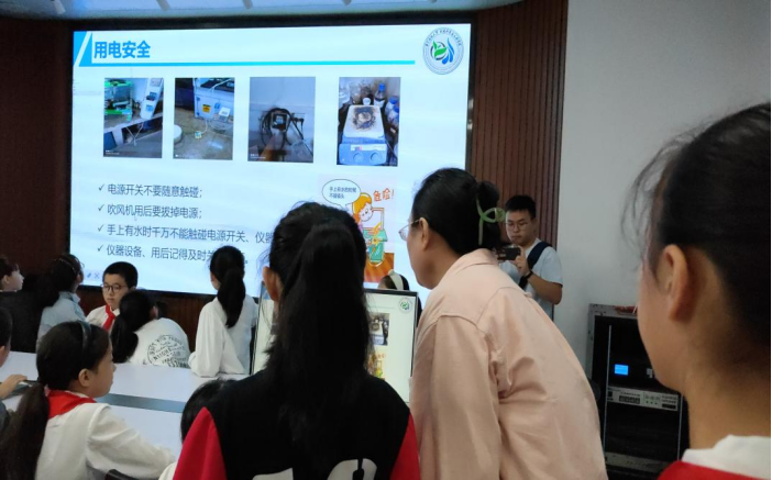 在环境楼实验室科普站,负责讲解的老师们带领同学们依次参观水质大厅、大气污染处理实验室、化学实验室、大型仪器平台等,现场进行布袋除尘和旋风除尘的演示。同学们还亲自上手用显微镜观察头发、树叶、毛线等,纷纷惊叹于微观世界的奥妙。在这里,大家提前感受到科研的魅力,接触到各类实验所用到的大型仪器设备,种下了一颗科技报国的种子。