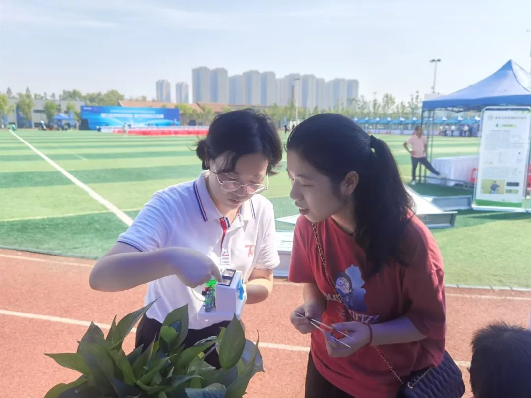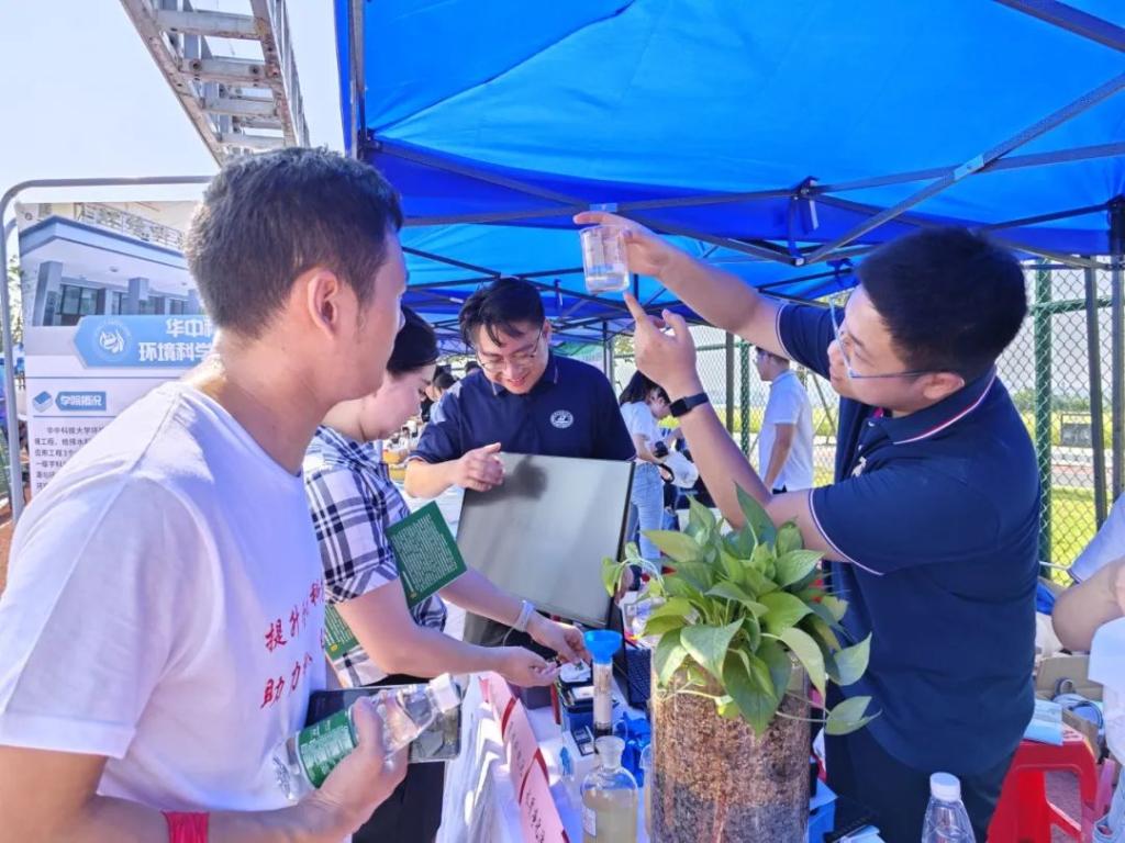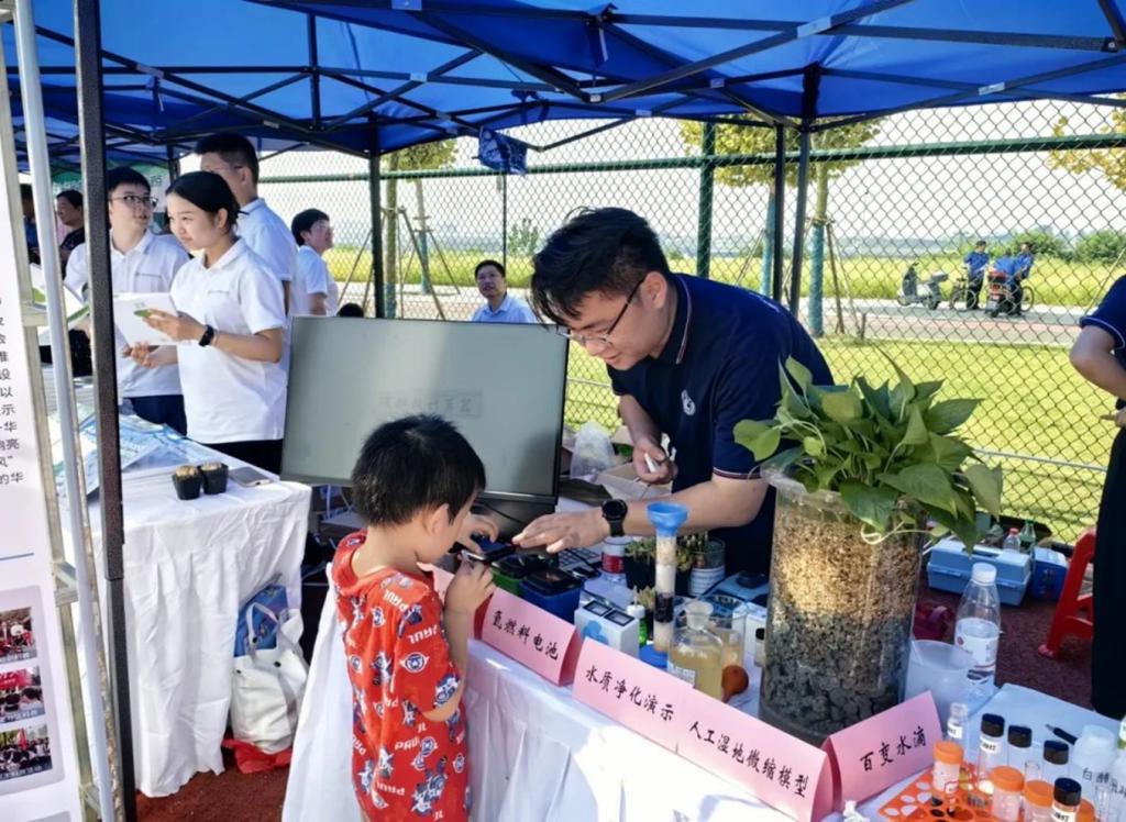 为了让参展者能够直观感受水生态环境修复的相关措施,现场还展示了一个人工湿地的微缩模型,模型利用工业固废制备可再生多孔填料,耦合黄铁矿构建复合人工湿地模拟装置,既减少了不可再生填料的开采和使用,同时实现微污染富营养化水体有效脱氮除磷,为流域生态环境保护提供可持续发展策略。模型旁边设置了水质净化的演示实验,包含絮凝、沉淀、过滤、吸附多个步骤。在互动体验区,设置了碳排放互动计算器、氢能源电池模型和“垃圾分类”互动小游戏,可以更直观的帮助大家理解和参与到国家“双碳”战略中来。