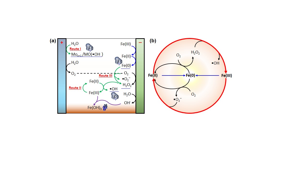 Fig. 1. Mechanism of sludge dewatering performance with the hybrid electrooxidation conditioning method: (a) process diagram of the related representative oxidation routes (Routes I, II and III) and the coagulation process in the hybrid conditioning strategy, and (b) Fe circulation process diagram enhanced by molecular oxygen activation by in situ generation of ZVI.