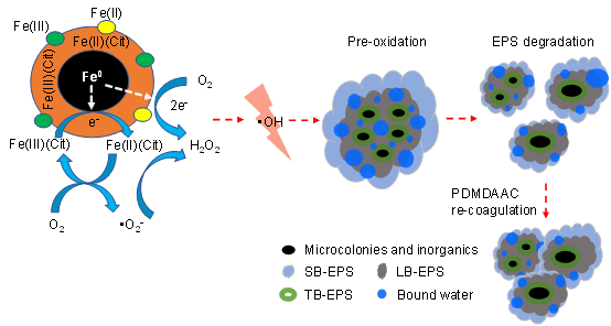 文章报道了一种新的污泥调理方式(air/CA/nZVI/PDMDAAC),无需外加双氧水,可以原位产生双氧水,在纳米零价铁和空气的激活下氧化降解污泥胞外聚合物,将结合水转化为自由水。同时加入的PDMDAAC药剂,可以起到络合的作用。在最优条件下CST能从130.0s降到9.5s,污泥脱水效果可以显著提高。此外,最终滤液的pH接近中性,无需外加酸碱进行调节。本文为污泥脱水提出了一种全新的方法,是一种经济环保的污泥脱水调理方式。