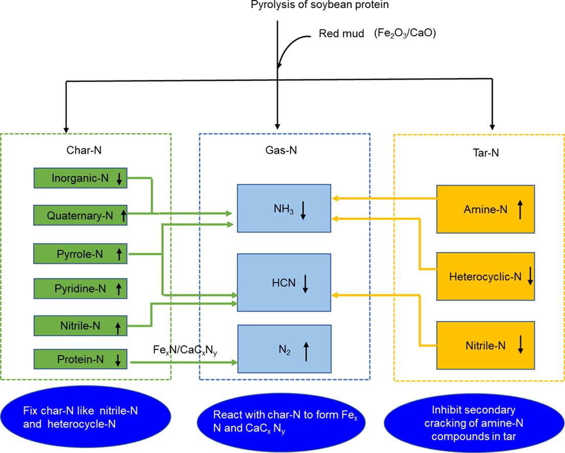 文章以含氮种类与污泥相似且结构简单的大豆蛋白作为污泥模型化合物,分别在温度为400、500、600、700和800 oC 开展热解实验。研究发现,赤泥促进了N在大豆蛋白热解残渣中的固定,抑制了N向焦油-N的转化,而促进了Gas-N的生成。进一步研究发现,赤泥添加比例越高,对N在残渣中的固定作用越明显,对NH3和HCN释放的抑制作用更显著,同时有更多的无污染性N2产生。根据对固相残渣的XPS分析以及焦油的GC-MS分析发现赤泥有助于促进残渣中腈-N、季-N这类较稳定含-N官能团的生成,同时抑制了焦油中胺-N化合物的分解。此外,分别向大豆蛋白中单独添加赤泥中的三种主要矿物成分Fe2O3、Al2O3和CaO,开展热解温度为400、500、600、700和800 oC 的热解实验。研究发现:Al2O3对热解过程中N转化几乎没有影响,但Fe2O3和CaO对此过程影响较大。综合以上分析结果,推测赤泥对于氮转化影响的作用机理主要包括三方面:(1)赤泥中的Fe2O3和CaO有助于污泥热解残渣中形态较稳定的固相-N官能团的形成,从而促进了N在热解残渣中的固定;(2)Fe2O3和CaO可以与残渣中N 发生反应形成间质性的氮化铁和氮化钙,通过这两种物质的不断分解和合成过程,可能使得更多的NH3和HCN最终转化成了N2和H2,有效减少了NH3和HCN的释放;(3)在热解温度为400-500 oC,主要是赤泥中Fe2O3抑制了热解焦油中胺-N化合物的二次裂解,而当热解温度高于500 oC时,赤泥中的Fe2O3和CaO均表现出对胺-N化合物二次裂解的抑制作用,相应的减少了杂环-N和腈-N 化合物的生成,从而减少了NH3和HCN的释放。