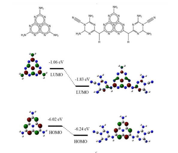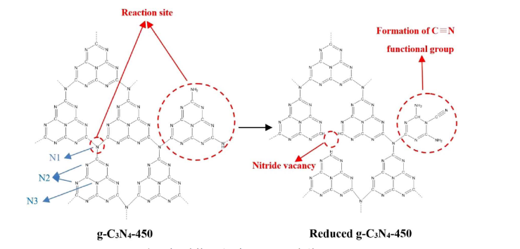 在第一篇论文中,我们首次以低聚合度的g-C3N4为前驱体,采用NaBH4还原的方法制备出还原态g-C3N4,成功实现了N掺杂。通过XPS、FTIR等表征得出材料在还原处理后形成了N空位和C≡N,其中N空位形成了间接吸收能带,大大提高了材料的可见光吸收能力,C≡N的形成使g-C3N4材料能带下移,价带氧化能力增强。之后通过旋转圆盘电极测试,证明材料的光催化机理是双电子还原。再通过理论计算,深入的探究了材料的结构变化对光催化性能的影响,进一步证实了上述的结论。该材料在可见光条件下H2O2产率高达170 μmol/L h−1,达到了较好的光催化储能效果,成功实现了环境领域中光催化产清洁能源的目的。在后续的研究中,张延荣教授团队将铁与光催化材料结合,利用材料高产H2O2的优越性能,构筑原位Fenton反应体系,用于降解污染物。