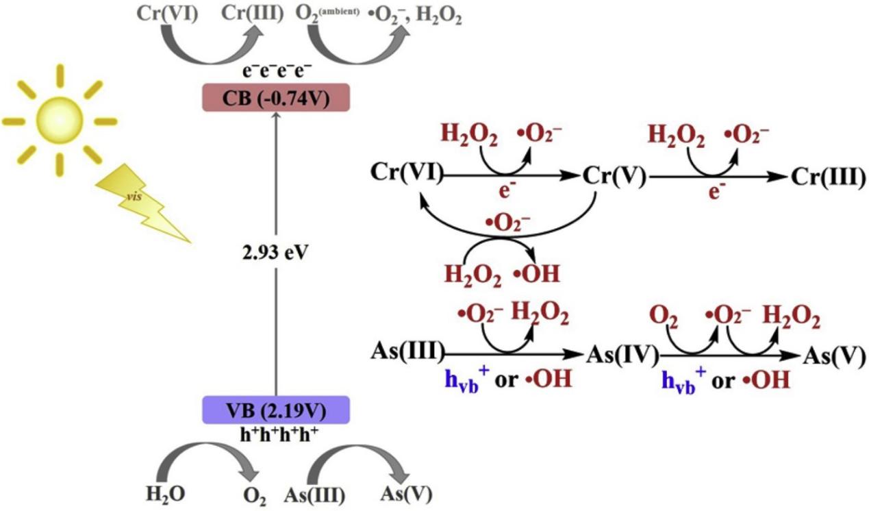 在第二篇文章中,我们同样采用g-C3N4基光催化材料,通过掺杂均苯四甲酸二酰亚胺(PDI),高效实现了酸性废水中As(III)和Cr(VI)的协同转化。与广泛商业化使用的TiO2 (P25)相比,其具有优异的耐久性。另外,光催化产生的e-、h+、•O2–、H2O2是协同转化As(III)和Cr(VI)的主要活性物质。除此之外,原位建立的Cr(V)/H2O2 类芬顿体系产生的•OH被证实是两种污染物协同转化的重要因素。该研究在实现酸性废水中两种重金属污染物协同转化的同时,也为构建光催化原位类芬顿系统提供了新思路。