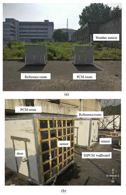 研究论文Experiment study on thermal performance of building integrated with double layers shape-stabilized phase change material wallboardEnergy 167 (2019) 1164-1180)通过自制定型相变板,搭建相变房与参考房的实验平台,测试了两个房间在武汉实际气候条件夏季和冬季的热性能,包括房间内外壁面热流、温度、室内温度。实验研究结果表明相比于参照房而言,相变房可在夏季和冬季分别起到蓄热隔热与储热保温的作用,大大改善了建筑室内热环境,该实验结果其可作为推广该新型功能性墙体的重要依据。