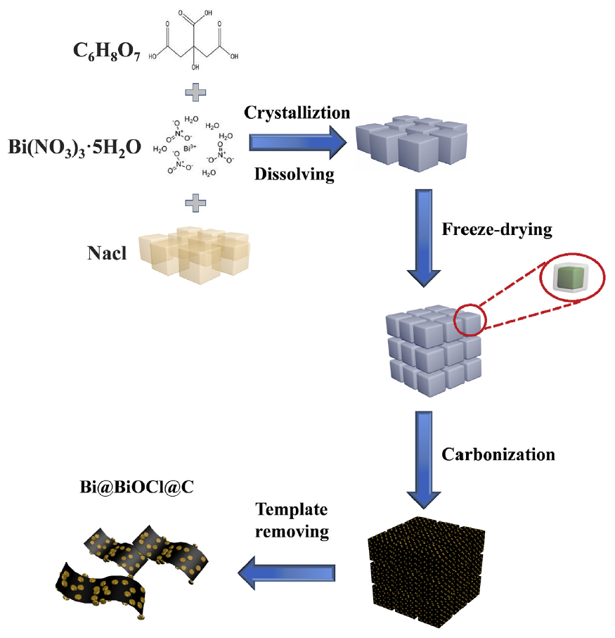 该论文研究提出以NaCl为模板、柠檬酸为碳源,一步热解快速合成Bi@BiOCl纳米颗粒负载在碳纳米片上形成具有独特3D介孔-大孔型多级孔结构的碳铋复合材料。自组装的可溶性氯化钠会在其晶体之间提供丰富的限域空间,促使氯化钠颗粒之间形成超薄的碳纳米片,同时也能合成纳米级别的铋基材料颗粒且有效抑制其团聚。研究发现前驱体中不同铋源含量直接影响铋基材料的成分、颗粒粒径大小以及碳基载体的石墨化程度和孔隙结构等。通过优化对比,测得当铋源含量为0.97 g时,重金属离子性能检测达到最佳,在1~60 ppb Pb2+和Cd2+浓度范围内,获得线性关系的灵敏度分别是0.38和0.49 μA ppb−1,线性相关系数分别是0.996和0.998,其检测限分别为0.2和0.4 ppb,均低于WHO规定值。另外,该新型传感平台显示出优异的抗干扰性、稳定性和重复性,并成功应用于湖水和自来水等实际水样的检测。
