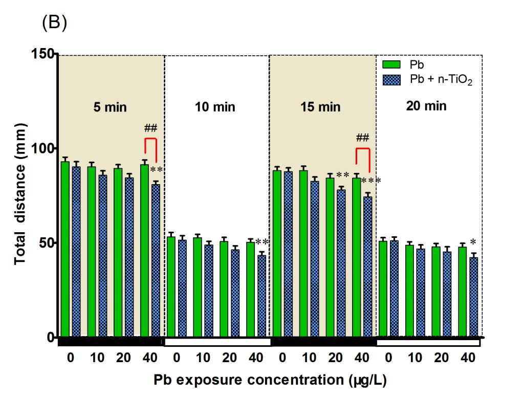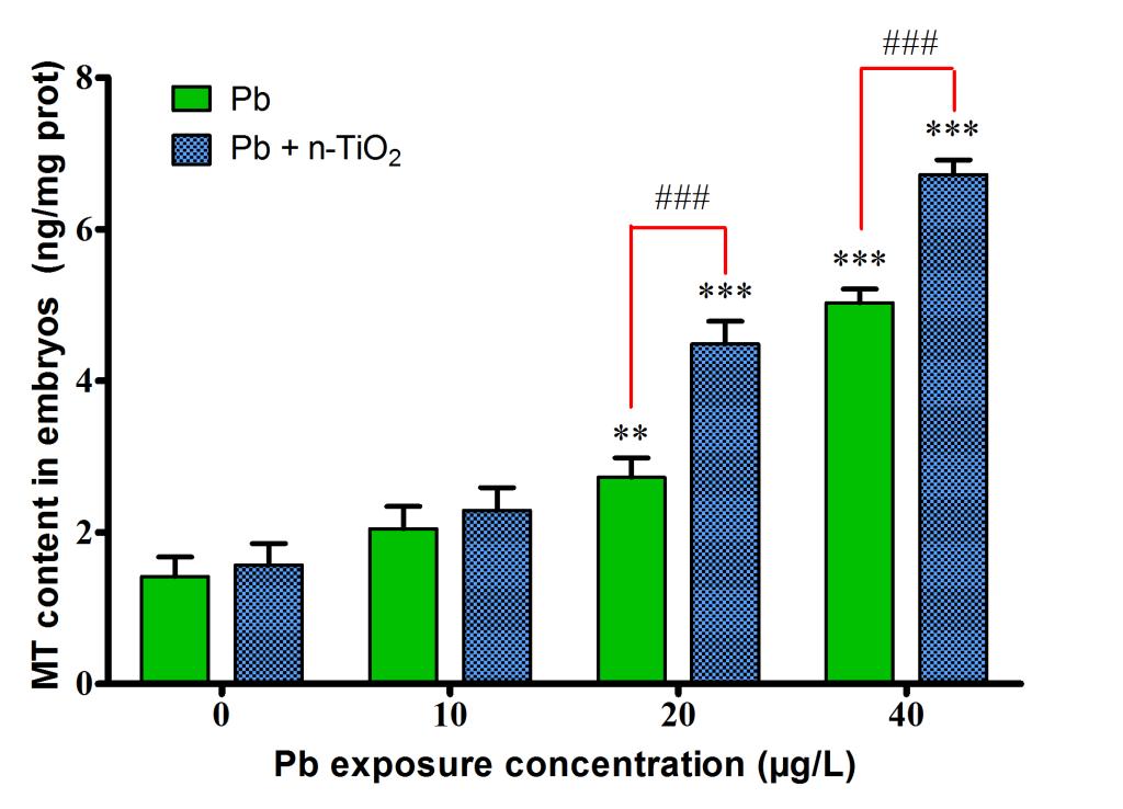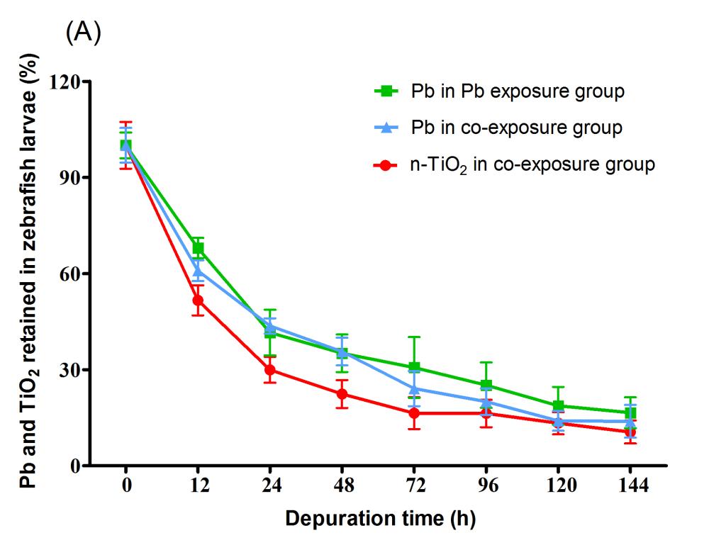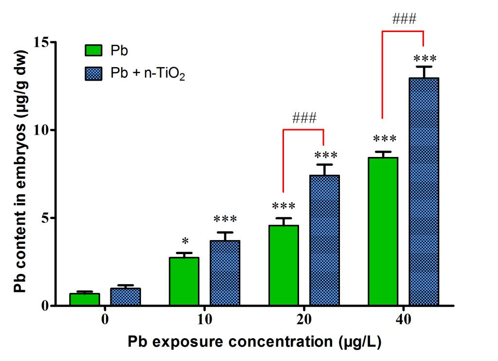 纳米二氧化钛(n-TiO2)因其独特的物理化学性质,会吸附水环境中共存的重金属,从而对重金属的生物可利用性和毒性效应产生影响。目前,关于n-TiO2对重金属在鱼类胚胎期毒性效应影响的研究较少。该论文以斑马鱼胚胎(2 hpf)为受试生物,研究了纳米二氧化钛(n-TiO2)对Pb2+在斑马鱼胚胎内生物富集、排出和毒性效应的影响。n-TiO2的存在显著地促进了Pb2+在胚胎内的生物富集。同时,胚胎内观察到内化的NPs-Pb复合物,表明n-TiO2可穿透胚胎的绒毛膜,进入鱼体内。此外,n-TiO2并未对Pb在胚胎内的排出速率产生影响。复合暴露导致胚胎金属硫蛋白(MT)含量进一步增加,与神经发育相关的基因(gfap、syn2a、elavl3)的表达水平显著下调,同时孵化后仔鱼的运动行为受到显著抑制。结果表明,n-TiO2可以作为Pb2+的有效载体,增强Pb2+在斑马鱼胚胎中的生物富集、生物可利用性和毒性效应。本研究将有助于进一步了解,n-TiO2是如何影响共存重金属离子在斑马鱼胚胎内的生物可利用性及其毒性效应。