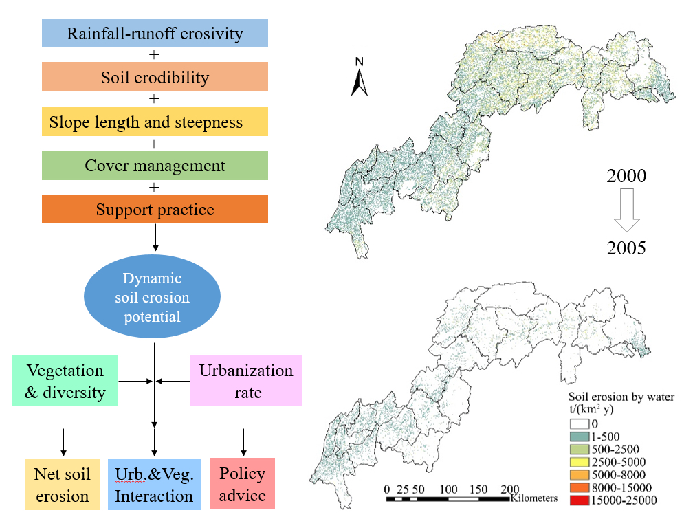 三峡库区在我国是一个生态和政治上都十分重要的地区,土地利用/覆被变化迅速,容易发生与土壤侵蚀有关的许多环境灾害。本研究(1)估计了三峡库区最近的变化模式导致水土流失的风险,(2)分析了土壤侵蚀风险的变化与土地利用和土地覆盖变化之间的关系,和(3)检查了城市化和自然资源管理实践之间的相互作用是否能产生影响的风险。研究结果表明,土壤侵蚀风险从2000年的14.7×106 t下降到2015年的1.10×106 t,其中侵蚀风险最大的地区是库区的中部和北部。长江水面的增加(由于三峡大坝建成后水位的上升,增加了61.8%)与土壤侵蚀风险呈负相关。三峡地区的造林(测量到的森林面积增加了690平方公里,NDVI改善了8.2%)与土壤侵蚀风险的积极缓解有关。确定了城市化(城市现存面积增加300平方公里)与植被多样化(减少0.01)之间的交互作用,仅在城市化率较低的地区,植被多样化对土壤侵蚀风险的影响为负。研究结果突出了优先考虑跨部门土壤保护政策的重要性,为协调城市化和自然资源管理之间的平衡提供决策支撑信息。