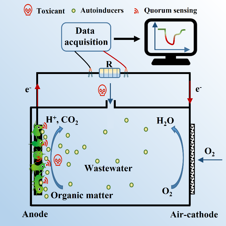 微生物燃料电池(MFC)是一种利用产电生物膜将有机物中的化学能转换为电能的装置,在水体生物毒性在线监测领域有广泛的应用前景。该论文以产电生物膜为核心,探究产电生物膜内在性质对微生物燃料电池毒性传感器性能的影响。群体感应是一种微生物群体之间进行“细胞对细胞的交流”的通讯机制,使得微生物能够在复杂的环境中协调一致,以“团队作战”,让整个种群更好地存活下来。该论文采用外加群体感应信号分子进行调控生物膜性质(构建实验组反应器),同时设立空白对照组和反对照组(添加酰基转移酶降解微生物自身分泌的信号分子)。选用Pb2+和Cu2+作为毒性传感因子,分别探究低浓度低毒性重金属离子(Pb2+)对传感线性度的影响以及受高浓度高毒性重金属离子(Cu2+)刺激后反应器的电化学恢复性能。研究发现,加强的群体感应效应有利于形成活细胞比例更高、产电菌(Geobacter)比例更大的产电生物膜,使得MFC传感器对0.1 mg/L-5 mg/L Pb2+传感线性拟合R2高达96%;同时,实验组在受到10 mg/L铜离子刺激后,仍能在短时间内恢复系统性能。该论文从产电生物膜的角度出发,发现了一种新型的有效手段调控生物膜内在性能,加速了MFC毒性传感器的应用进程。