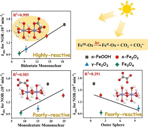 Science of the Total Environment文章比较性研究了四种铁氧化物(α-FeOOH、α-Fe2O3、γ-Fe2O3和Fe3O4)在紫外/草酸/铁氧化物体系(UV/IO/Ox)中催化活性与其表面及结构性质的关系。结果表明草酸和铁氧化物形成的表面双齿双核配合物含量决定了光化学反应速率(Science of the Total Environment 697, 2019, 134220; doi.org/10.1016/j.scitotenv.2019.134220)。