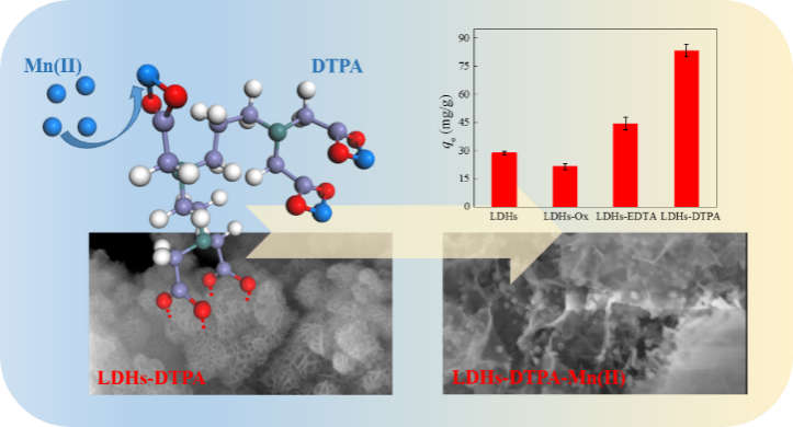 Journal of Environmental Sciences文章制备了一种DTPA改性的Mg/Al层状双金属氢氧化物材料(LDHs-DTPA),实现了对水中Mn(II)的高效吸附去除,并探究了相关吸附机理(Journal of Environmental Sciences, 85, 2019, 56-65; doi.org/10.1016/j.jes.2019.04.011)。