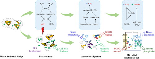 该研究利用均相芬顿体系(Fe(III)/PCA/H2O2)预处理剩余污泥促进厌氧消化产甲烷和微生物燃料电池回收鸟粪石的研究。通过三个连续的步骤将生物污泥中有机质和磷逐步释放以甲烷和鸟粪石的形式实现剩余污泥能源和资源的有效回收。原儿茶酸芬顿体系在中性条件下处理剩余污泥使其瓦解破胞释放胞内及胞外聚合物,将焦磷酸等聚合形态磷转化成正磷酸根,随后经过短暂的厌氧消化过程产生沼气和进一步释放磷,最后经过微生物燃料电池回收高纯度大颗粒的鸟粪石和甲烷。预处理步骤促进厌氧消化过程微生物群落的丰度和多样性的增加,提高甲烷产量,同时促进后续微生物燃料电池反应器中鸟粪石的结晶和沉淀,磷回收小效率达95%,鸟粪石纯度为74.4%。