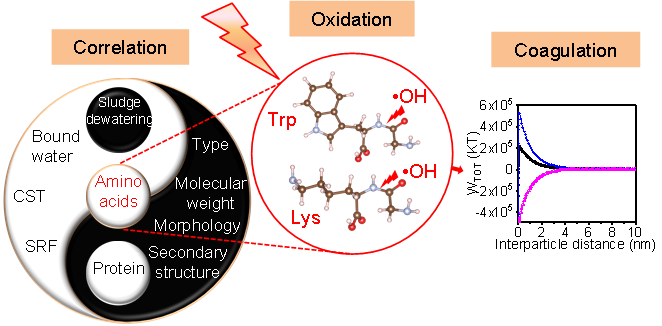 高级氧化调理污泥脱水过程中,污泥蛋白质的肽链可被分解为氨基酸。污泥中的蛋白质对脱水性能有较大影响,但氨基酸在污泥脱水中的作用仍不清楚。该文章研究了Fenton调理污泥脱水过程中的氨基酸变化。研究结果发现色氨酸(Trp)和赖氨酸(Lys)为影响Fenton调理污泥脱水性能的关键氨基酸。通过分析氨基酸变化与蛋白质特性(分子量,二级结构,种类和形态)的相关性,发现氨基酸的释放可能来源于羟基自由基对膜蛋白和核糖体蛋白的破坏。首次运用DFT计算模拟氧化过程中氨基酸的产生,发现与色氨酸相连的肽键比其他氨基酸更易分解。最后利用扩展的DLVO理论进一步验证了鉴定的关键氨基酸对污泥絮体的凝聚性能影响。