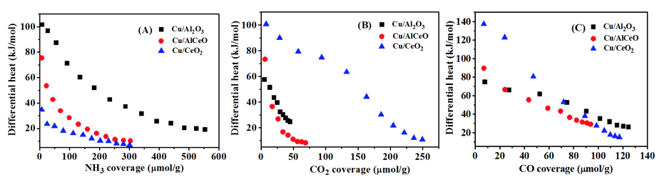 图1.Cu/Al2O3、Cu/AlCeO和Cu/CeO2催化剂对NH3(A)、CO2(B)和CO(C)的吸附量热数据