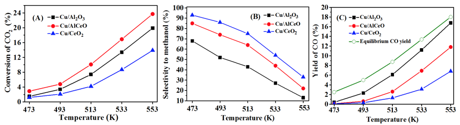 Al2O3表面主要呈酸性,CeO2表面主要呈碱性,采用共沉淀法制备了3种表面不同酸碱性的Cu基催化剂,分别为Cu/Al2O3、Cu/CeO2和Cu/AlCeO (Cu/CeO2/Al2O3),表面酸碱位强度及数量用吸附量热进行了表征(图1(A)和(B))。随着载体中CeO2含量的增加,催化剂表面碱性明显增强。图2是3种所制备催化剂对CO2催化加氢的性能数据。研究结果表明,强表面碱性有利于增强甲醇的选择性。原因可能是强表面碱性增强CO在催化剂表面的吸附,抑制逆水汽反应,进而提高了甲醇的选择性(图1C)。同时,适量增加Al2O3的含量,有利于Cu粒子分散,Cu颗粒的高分散有利于CO2催化活性的提高。最终,Cu/AlCeO催化剂获得了最优的催化CO2加氢制甲醇性能,CO2转换率在553K时达到23.7%,甲醇选择性在473K时达到85%,甲醇产率在533K时达到7.4%。(Catalysis Today, 2020, 339, 352-361. (ESI高被引论文))