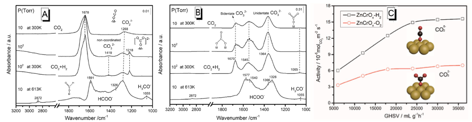 图4. (A)ZnCrOx-H2和(B)ZnCrOx-O2样品的原位漫反射红外光谱图(测试前样品在20vol.%H2/N2气氛下350 oC处理1小时,然后样品在特定压力和温度下经CO2或CO2和H2混合气吹扫后进行测试);(C) ZnCrOx-H2和ZnCrOx-O2样品上CO2加氢活性图。