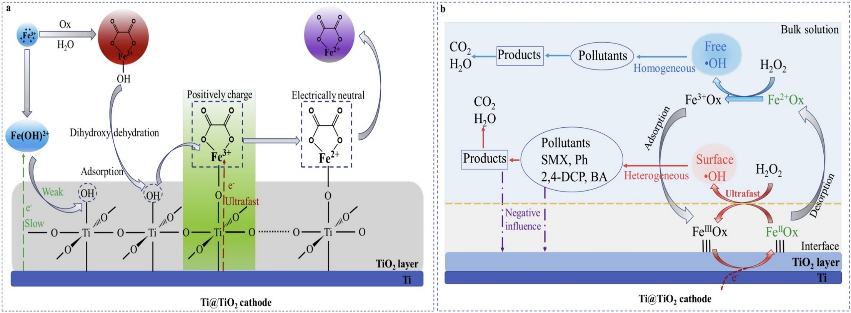 Journal of Hazardous Materials发表的文章(J. Hazard. Mater., 392, 2020, 12268; 全文链接:https://doi.org/10.1016/j.jhazmat.2020.122268)建立了一个新型的草酸盐强化电还原芬顿体系,并成功应用于实际废水的高效低耗处理,揭示了草酸铁配合物与Ti@TiO2电极表面羟基形成Fe-O-Ti键对界面铁循环的强化机理。