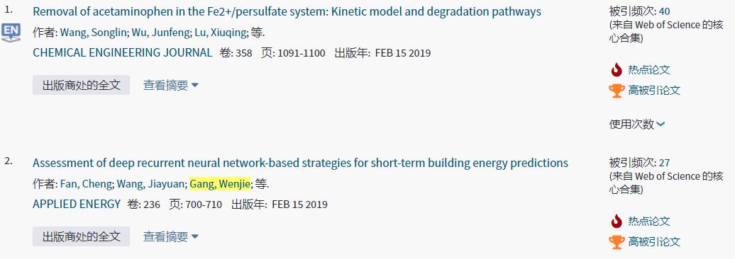 公司入选的两篇ESI热点论文分别为:(1)Removal of acetaminophen in the Fe2+/persulfate system: Kinetic model and degradation pathways(Chemical Engineering Journal, 2019, 358, 1091-1100),beats365为第一作者单位兼通讯作者单位,第一作者为公司王松林教授,通讯作者为公司谢鹏超副教授,Web of Science被引频次为40次;(2)Assessment of deep recurrent neural network-based strategies for short-term building energy predictions(Applied Energy, 2019, 236, 700-710),beats365与深圳大学土木与交通工程公司分别为通讯作者单位和第一作者单位,公司刚文杰副教授为通讯作者,Web of Science被引频次为27次。上述两篇论文亦同时入选ESI高被引论文。