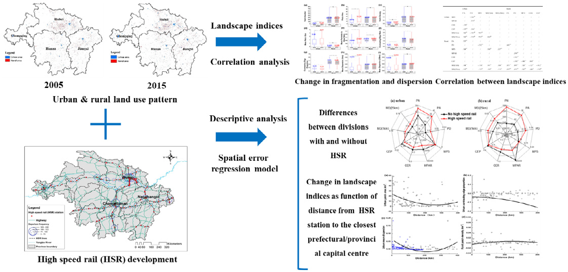 论文采用景观指数描述了2005年至2015年期间长江中游地区城乡空间变化特征,探讨了高铁的影响,并进一步采用空间误差模型揭示了城乡空间变化特征与高铁地理位置(到高铁的距离表示)的非线性关系。研究结果揭示了生态重要区域的时空演变规律,为我国城乡形态研究领域的拓展提供了新的证据,为交通与土地利用综合空间规划提供了有价值的决策支持信息。