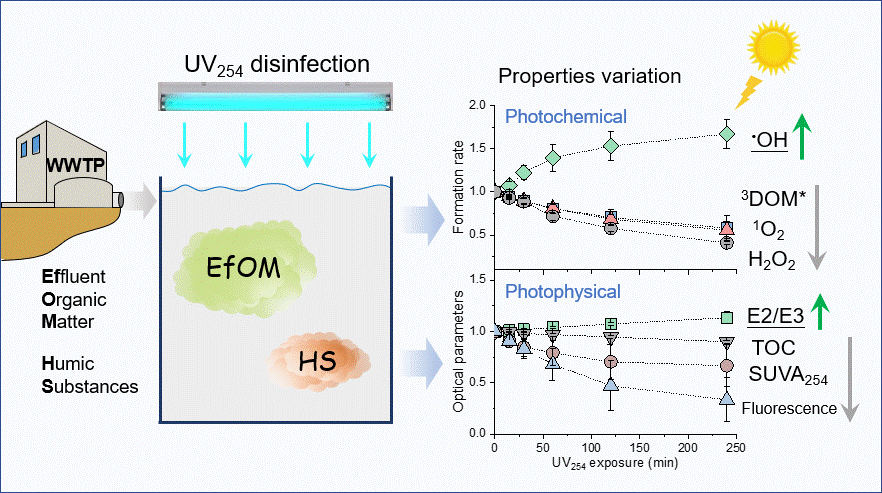 UV254是污水处理厂目前主要的消毒方法之一。近年来,污水处理厂出水有机物(EfOM)大量排入天然水体,成为了溶解性有机物(DOM)的重要组成,EfOM的光化学活性受到了广泛关注。在太阳光照射下,EfOM光敏化产生一些列活性物质,包括三线态EfOM(3EfOM*)、单线态氧(1O2)和羟基自由基(•OH)等,这些活性物质对水中微量有机污染物的去除具有重要影响。但是,UV254消毒对EfOM光化学活性的影响尚不清楚。本论文主要研究了UV254消毒后EfOM与典型腐殖质(HS)光物理和光化学性质的变化。结果表明,UV254消毒导致了DOM芳香度、荧光强度和分子量降低,同时抑制了模拟太阳光照射下活性物质(包括3DOM*,1O2,H2O2和O2•−)的产生,但是,UV254消毒使得DOM光敏化产生•OH的速率增大。1O2的量子产率与三线态量子产率系数(fTMP)呈正相关,而•OH的量子产率与EfOM和HS的fTMP分别呈正相关和负相关。对于UV254消毒前的DOM样品,其量子产率与E2/E3(254 nm 与 365 nm吸光度之比)呈正相关,而UV254消毒后其变化趋势出现明显差异。这些发现表明,污水处理厂的UV254消毒显著增加了废水出水中光敏化•OH的产生,同时,废水经过UV254消毒后结合太阳光照射有望成为一种新的技术用于进一步去除废水和受纳天然水体中的微量有机污染物。