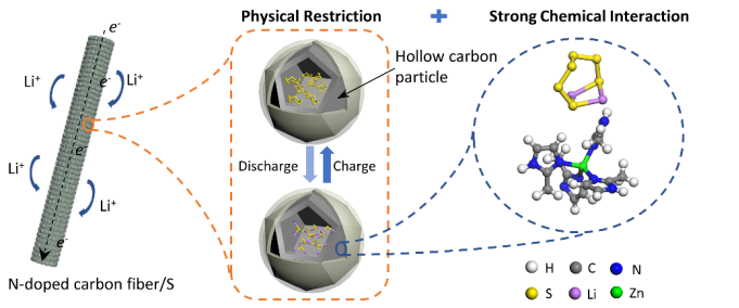 锂硫电池中硫正极虽然具有很高的理论容量(1675 mAh/g),但是较低的导电性以及放电过程中中间产物的溶解损失致使电池性能不够理想。一维多孔碳纤维材料具有良好的导电性和机械强度,在锂硫电池正极材料领域得到了广泛的关注,但是利用传统的模板法以及多步活化的方法来制备多孔碳纤维过程繁琐,而且操作危险,探究简单方便的碳纤维合成改性技术具有十分重要的意义。金属有机骨架化合物因为具有较高的比表面积在能源与环境领域得到了广泛应用,以其为原料来制备一系列功能化的衍生材料也具有良好的应用前景。