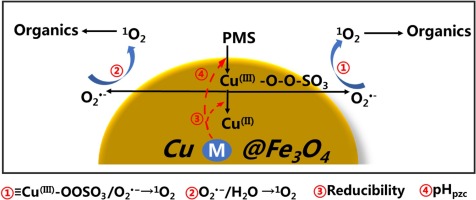 为提升过渡金属催化剂对过硫酸盐的催化效率,采用非氧化还原金属氧化物复合手段对多相过渡金属催化剂进行改性,制备了一系列能够高效活化过一硫酸盐(PMS)的多相催化剂。该研究揭示了非氧化还原金属氧化物调节多相催化剂中的功能以及1O2的生成途径,图文摘要描绘了CuM@Fe3O4活化PMS的具体机制。