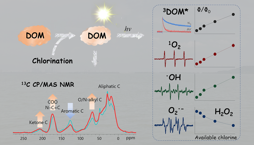 氯消毒是水处理常规消毒手段,特别是新型冠状病毒肺炎疫情爆发后,污水处理厂进一步增加投氯量以增强消毒效果,随着污水处理厂出水大量排放,更多余氯流入受纳水体。出水有机物(EfOM)和腐殖质(HS)在受纳水体溶解性有机物(DOM)的占比高达90%,在太阳光照射下,DOM光敏化产生一系列活性物质,包括三线态DOM(3DOM*)、单线态氧(1O2)和羟基自由基(•OH)等,这些活性物质对水中微量有机污染物的去除具有重要影响。但是,氯消毒对DOM光化学活性的影响尚不清楚。本论文主要研究了氯消毒后EfOM与典型HS光物理和光化学性质的变化。固态13C NMR和FT-ICR MS等结果表明氯化后DOM的芳香性、给电子能力(EDC)和平均分子量显著降低。本研究首次发现在模拟太阳光照射下,DOM氯化处理后3DOM*、1O2和•OH的量子产率显著增加,且其与E2/E3(254 nm与365 nm吸光度之比)呈正相关,与EDC呈负相关。本研究揭示了氯化反应对DOM光化学反应活性的影响机制,同时该研究结果也提供了一种氯消毒与光照协同的水处理方法,将显著提升有机污染物的光敏化降解。