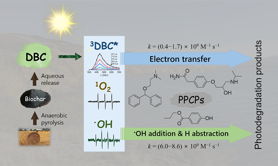 由于农业废弃物的燃烧和生物炭的大规模应用,溶解性生物炭(DBC)大量释放到地表水体成为溶解性有机物(DOM)的重要组成。DBC在太阳光照射下产生的活性物质(RS)对有机污染物降解起着重要作用。然而,RS和污染物之间的相互作用机理尚不清楚。本文以秸秆类生物炭溶出的DBC为研究对象,检测了模拟太阳光照射下DBC溶液中3DBC*、1O2和•OH的生成,及其对典型药物和个人护理品(PPCPs)的光降解。激光闪光光解和电子自旋共振光谱分析表明,相比于一些已研究的DOM,DBC展现出更高的RS量子产率,且显著促进了阿替洛尔、苯海拉明和对羟基苯甲酸丙酯等PPCPs的降解,其主要归功于3DBC*和PPCPs之间的电子转移反应,通过动力学模型得到相应的二级反应速率常数分别为1.15 × 109、1.41 × 109和0.51 × 109 M−1 s−1,并采用激光闪光光解进行了验证。此外,•OH也参与了PPCPs的降解。最后,利用高分辨质谱对光降解产物进行了鉴定,进一步证实了电子转移和•OH氧化机理。这些结果表明,农业生物质燃烧过程中溶出的DBC在太阳光下能有效地敏化水中有机污染物的降解。